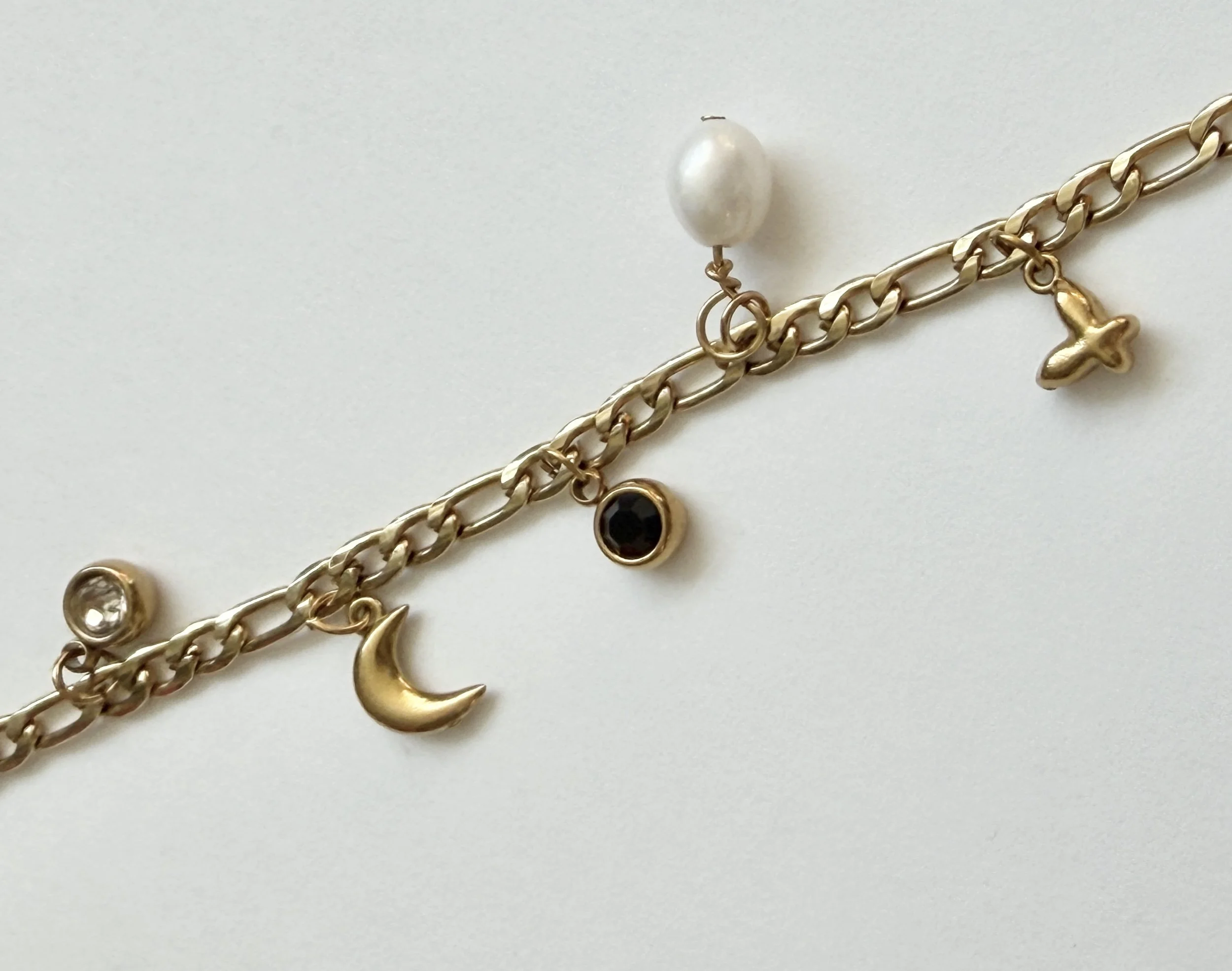 Jewelry pieces are made from jewelry grade stainless steel, hypoallergenic, polished to a shine. Charmed bracelet includes five charms and a chain for the wrist. Select from a variety of charms, ranging from natural gemstones, pearls, classic symbols, and more. Also select from a variety of chain designs, cut bespoke to your wrist, from a choice of 18kt gold plated or natural.